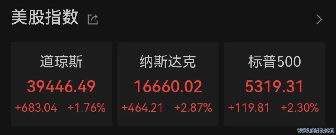 截至收盘,道指涨1.76%,报39446.49点,标普500指数涨2.3%,报5319.31点,纳指涨2.87%,报16660.02点。道指与标普500指数均创一年来的最大单日涨幅。
